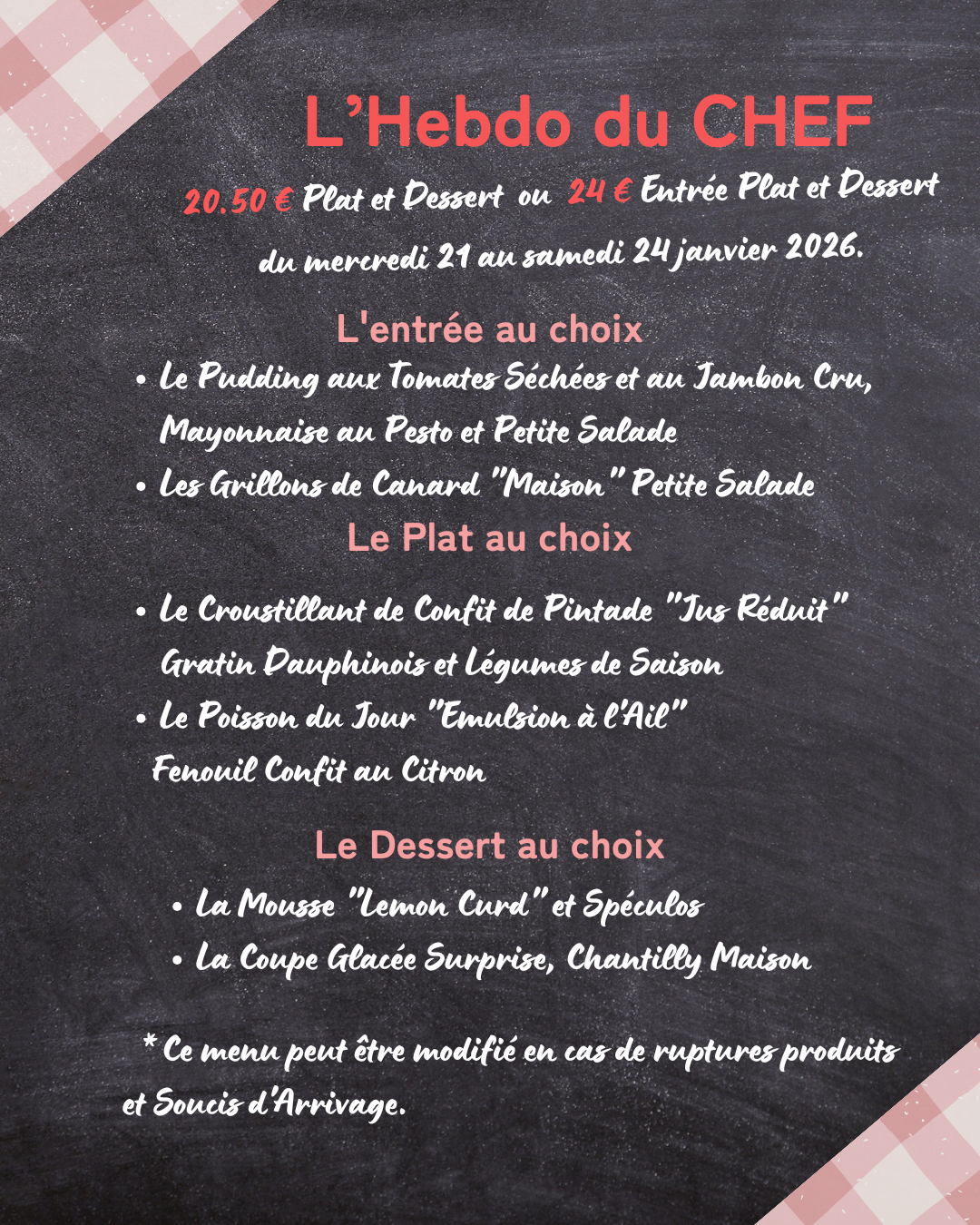 --- Au Bistrot L'Hebdo du CHEF à 24 € (Entrée, Plat et dessert) Proposé au déjeuner du mercredi au samedi ---