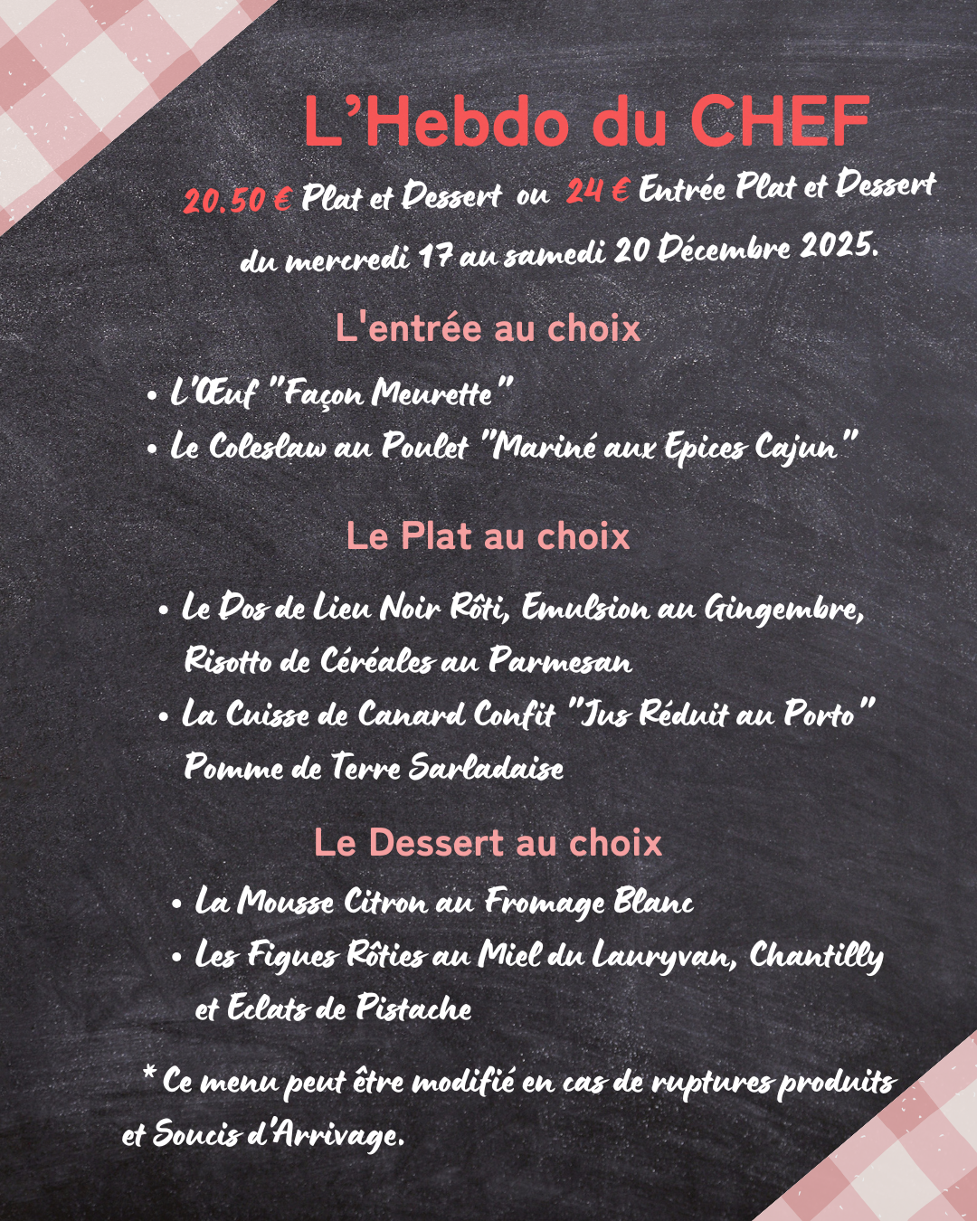 --- Au Bistrot L'Hebdo du CHEF à 24 € (Entrée, Plat et dessert) Proposé au déjeuner du mercredi au samedi ---